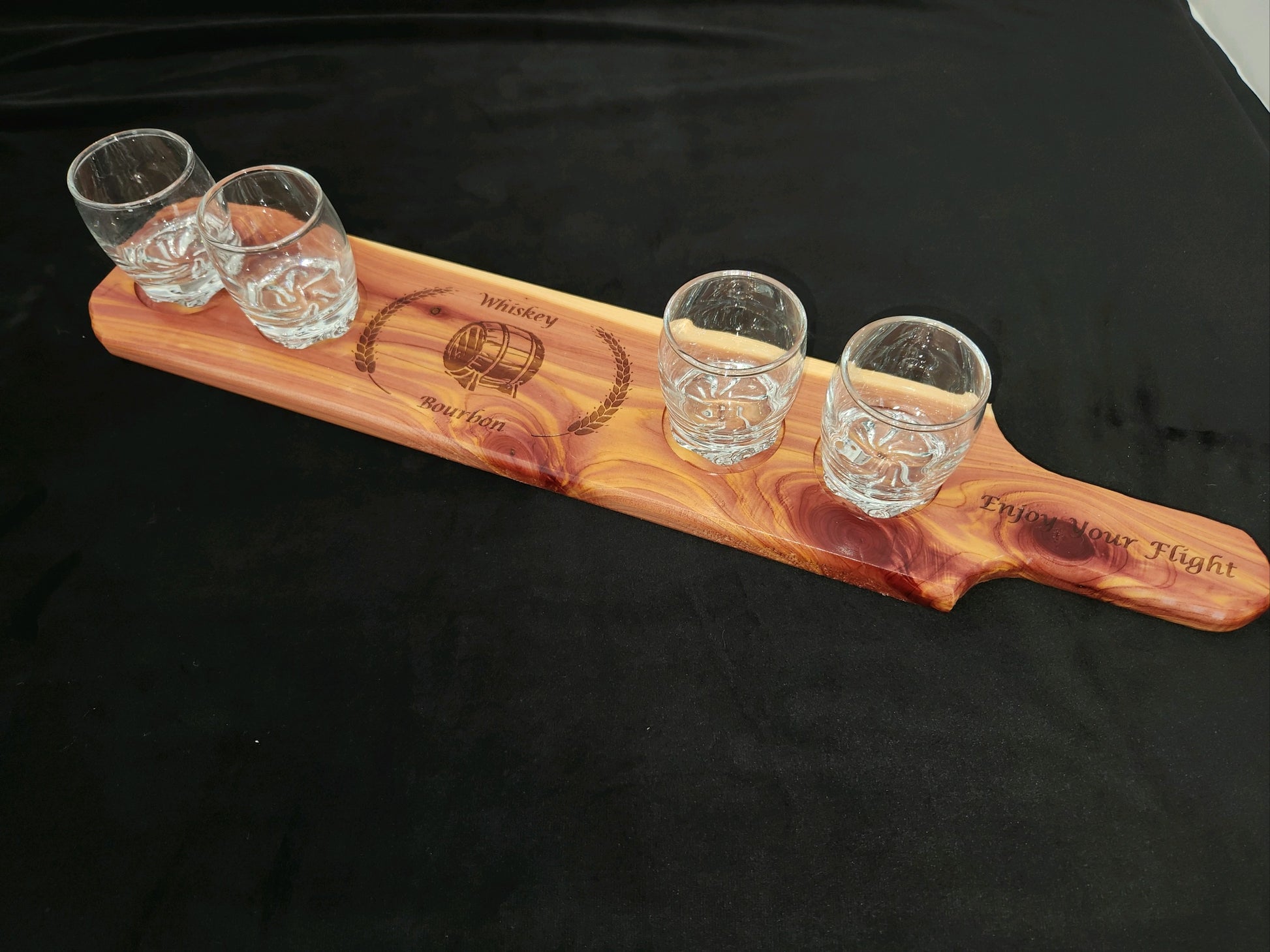 Solid Red Cedar flight boards with handle and 4 shot glasses. Laser Engraved with Whiskey/Bourbon symbol in center and Enjoy Your Flight on the handle. Beautifully sealed with Satin lacquer.